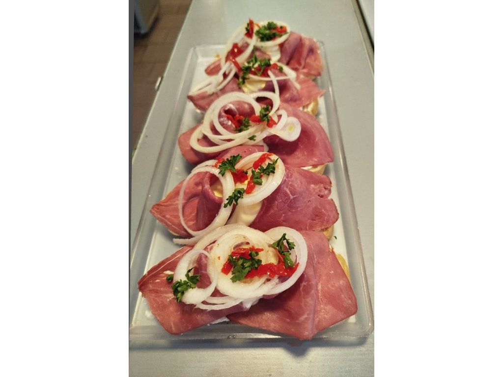 veka, majonéza, pomazánkové máslo,roastbeef (hovězí maso), cibule, okurka